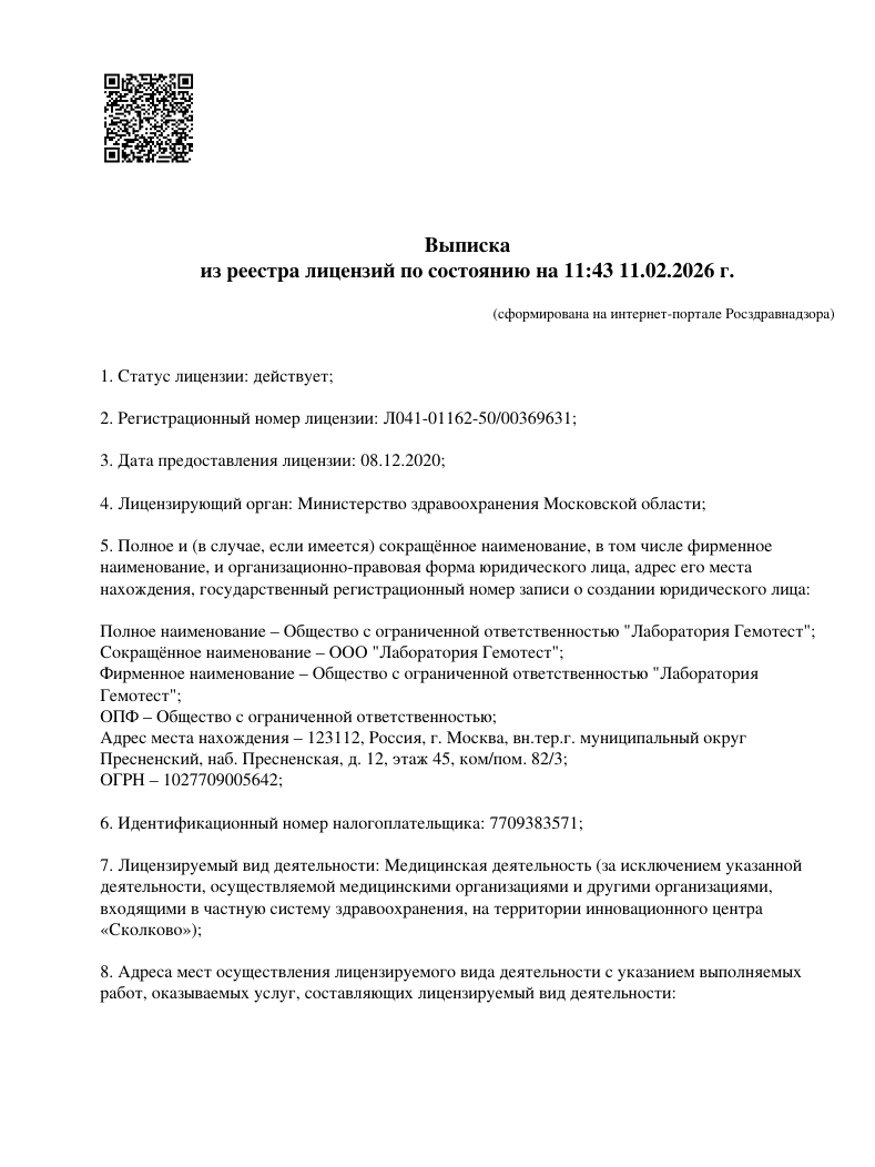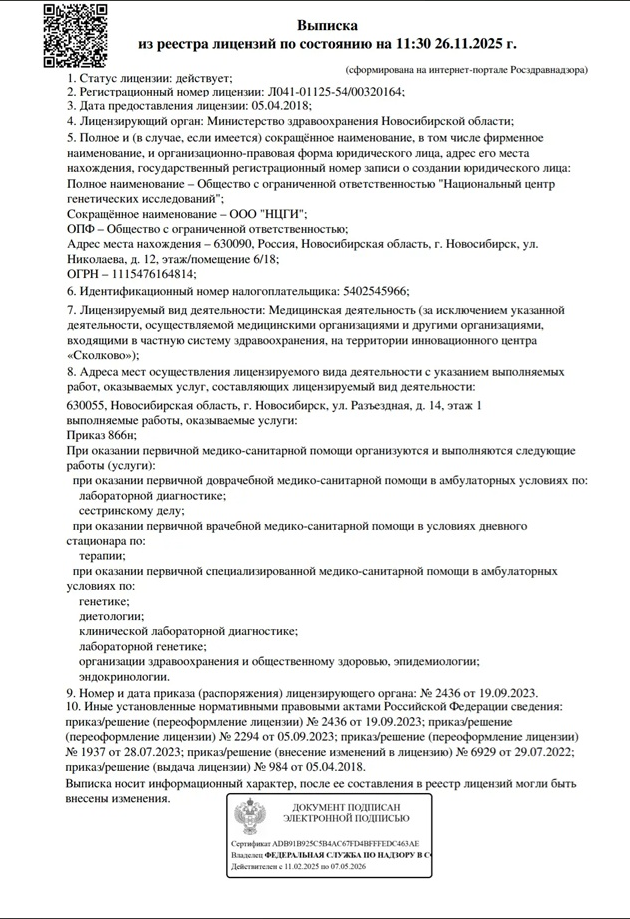Молекулярно-генетический центр «ДТЛ» является официальным представителем лаборатории ООО «ИнЛаб Генетикс» («InLab Genetics») в Байкальске. Все ДНК тесты проводятся на основании медицинской лицензии: № Л0-41-01148-78/00644845 от 23.03.2023 г..